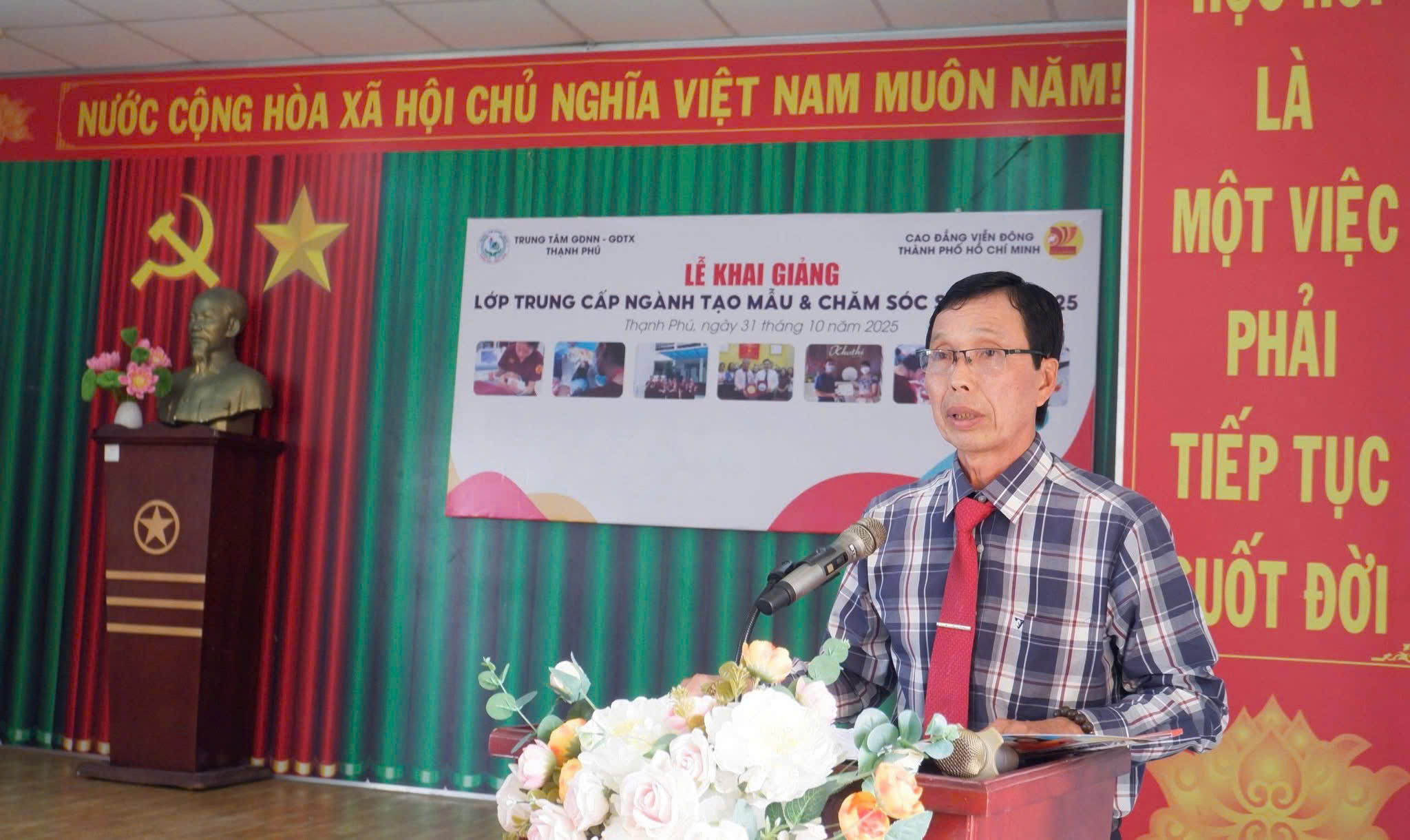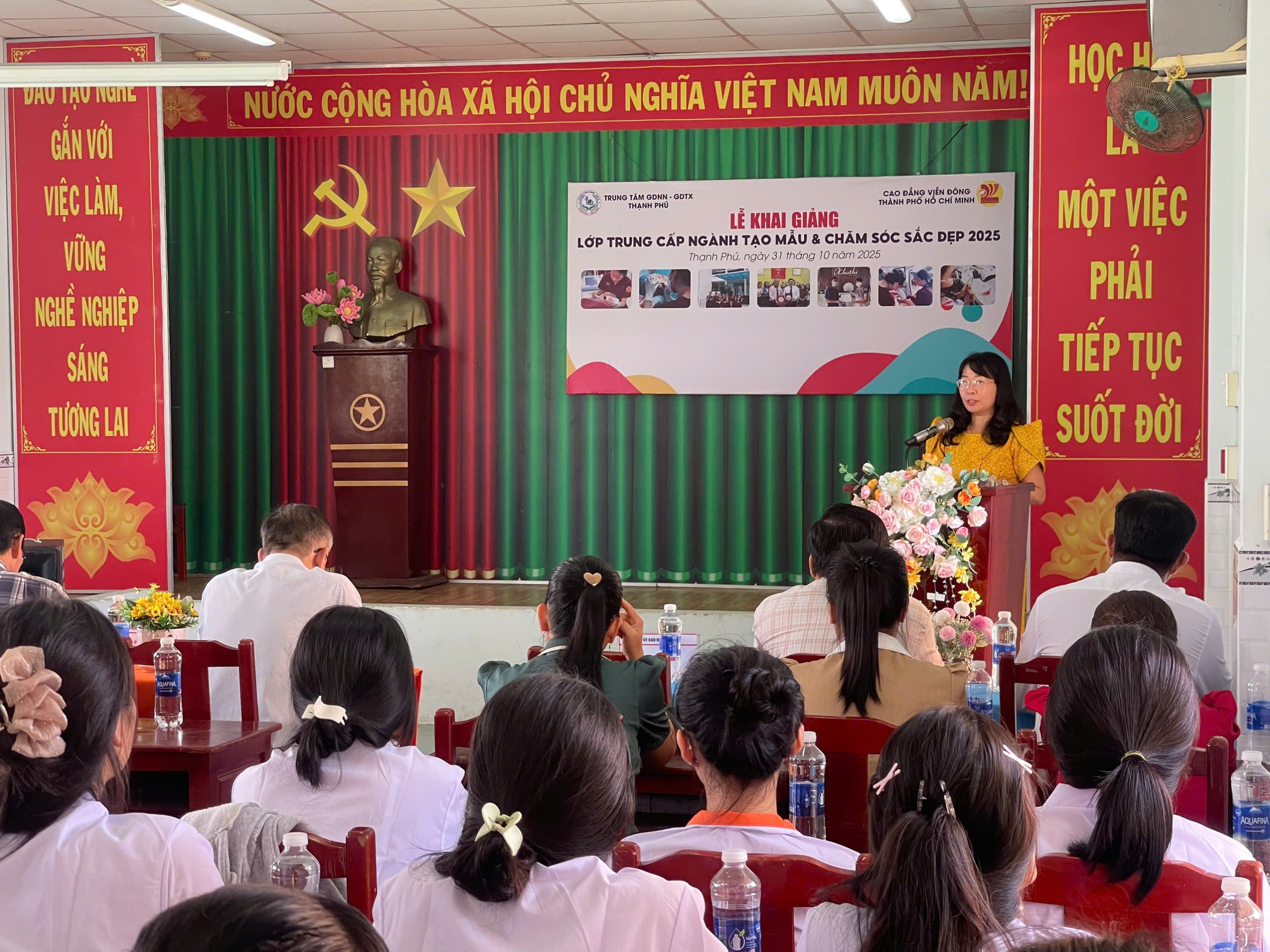 Chiều ngày 31/10/2025, Trường Cao đẳng Viễn Đông đã phối hợp cùng Trung tâm GDNN – GDTX Thạnh Phú long trọng tổ chức Lễ Khai giảng lớp Trung cấp ngành Tạo mẫu & Chăm sóc sắc đẹp.