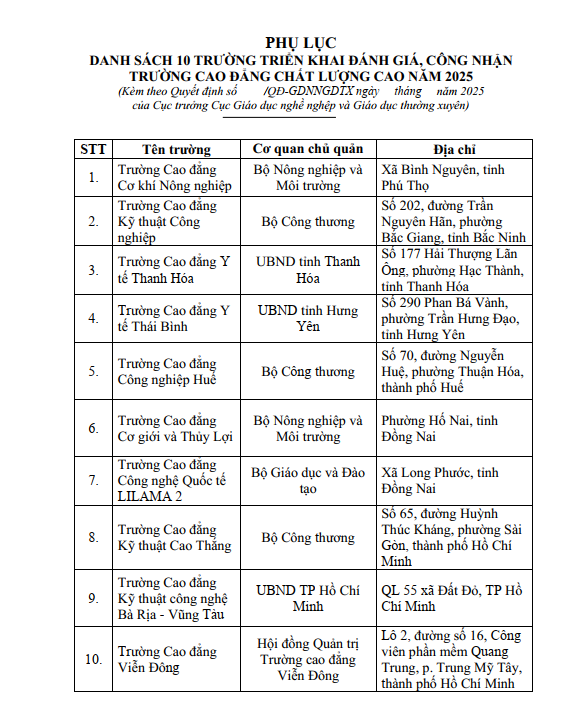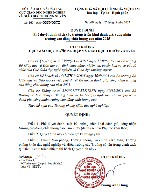 Ngày 17/11/2025, Cục Giáo dục nghề nghiệp và Giáo dục thường xuyên (Bộ Giáo dục và Đào tạo) đã chính thức ban hành Quyết định số 165/QĐ-GDNNGDTX về việc phê duyệt danh sách các trường triển khai đánh giá, công nhận trường cao đẳng chất lượng cao năm 2025.