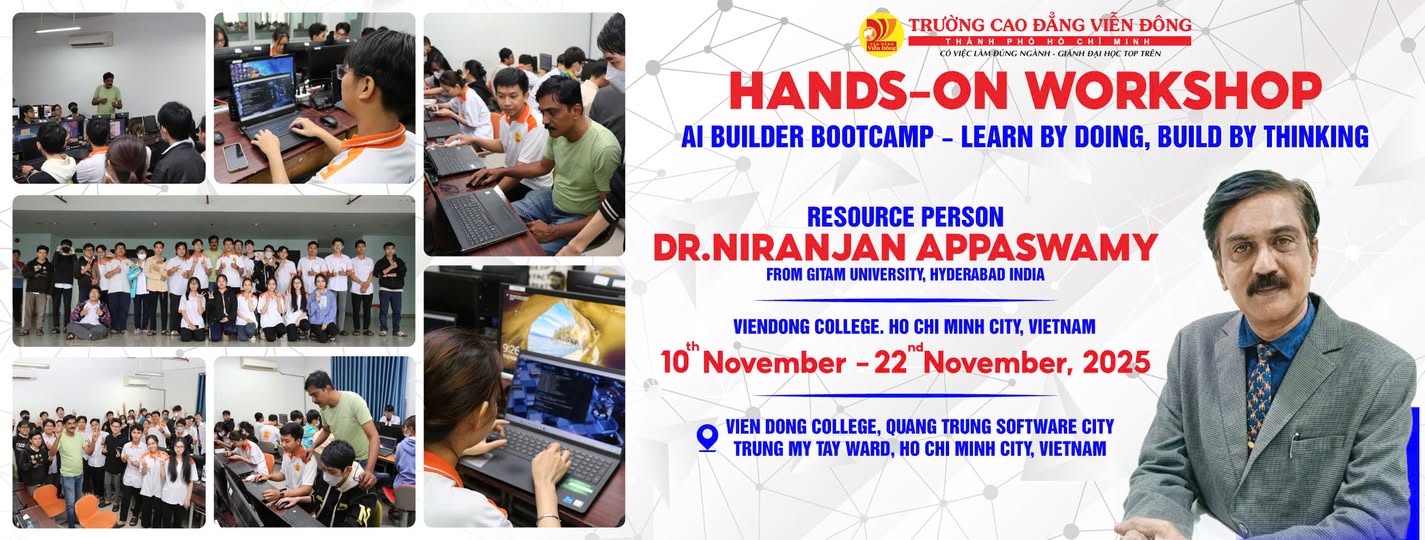 Vom 10. bis 22. November 2025 durfte das Viễn Đông College Dr. Niranjan Appaswamy von der GITAM University in Hyderabad (Indien) willkommen heißen. Er leitete persönlich eine Reihe praxisorientierter Workshops unter dem Titel ‚AI Builder Bootcamp – Learn by Doing, Build by Thinking‘.