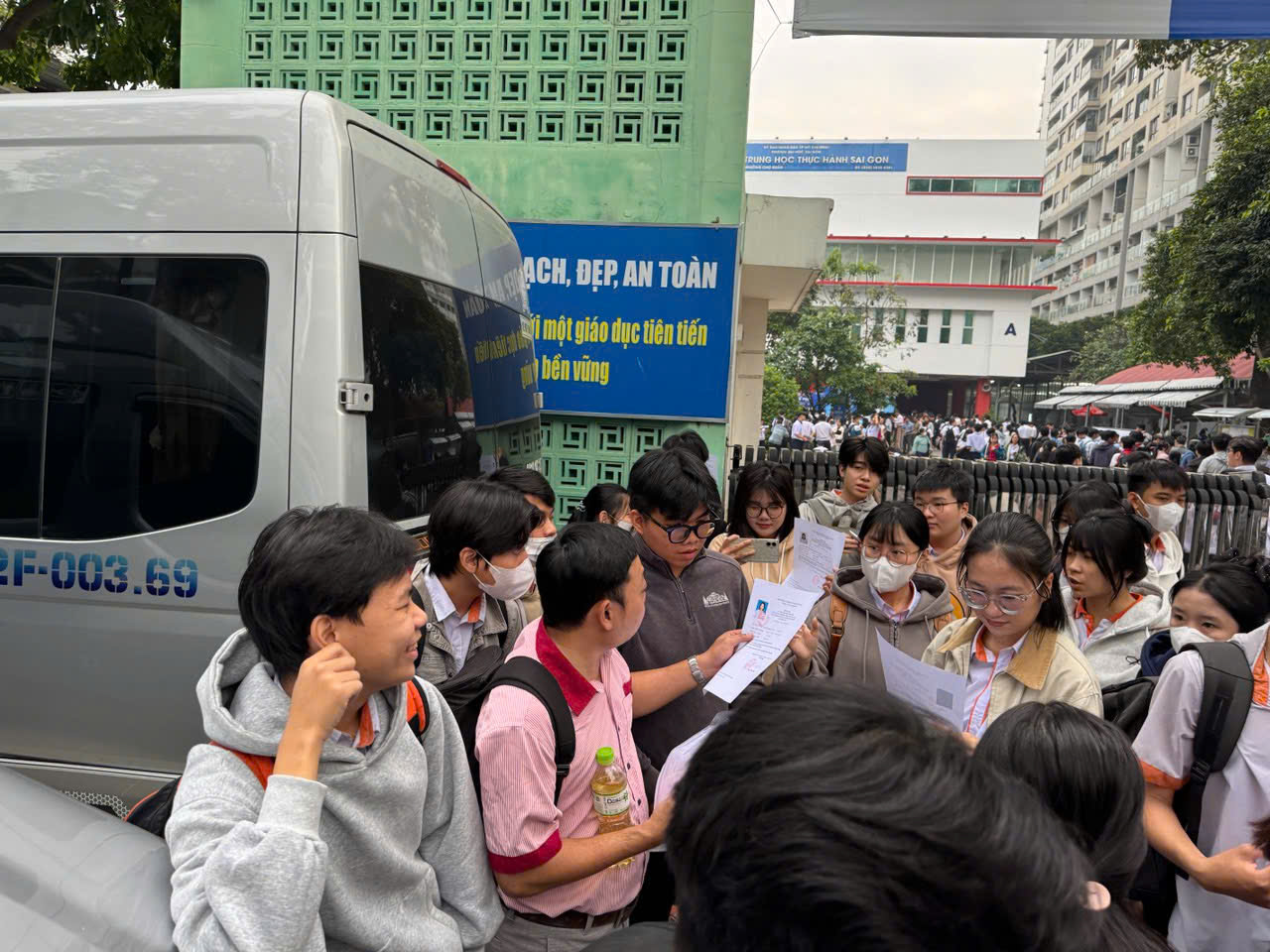 Tập thể học viên Cao đẳng Viễn Đông rạng rỡ tại cổng trường thi.